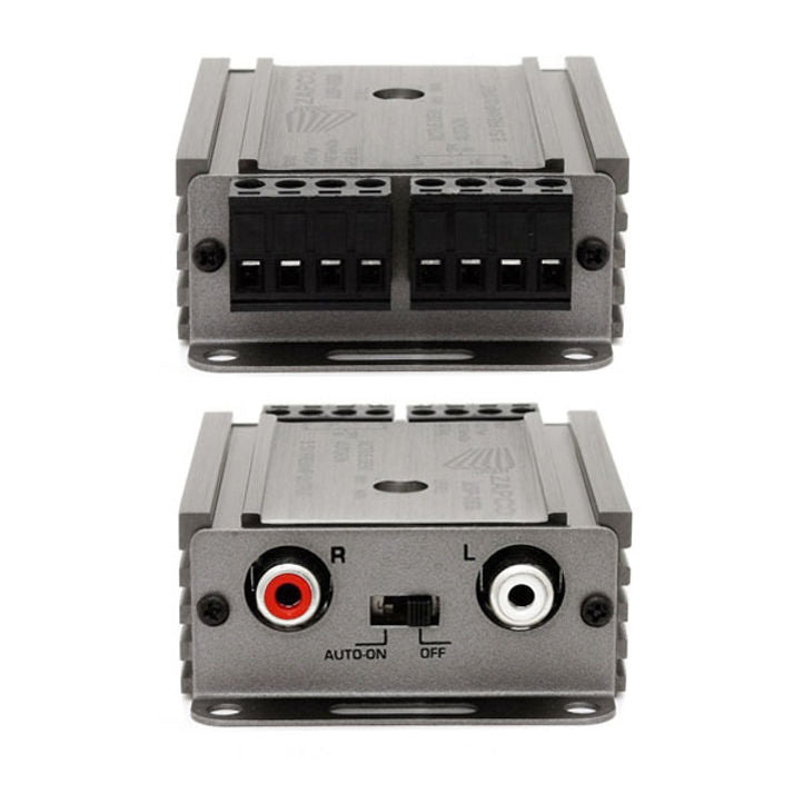 ASP-OEB: There has never been a unit like this one. The ASP-OEB is a basic 2-channel line converter with a difference. The ASP-OEB is a true active peramp with exactly the same circuitry that is in our other active adapters. The OEB has the same 9.5- Volt preamp that all our signal processors have. It also has adjustable preamp gain and Automatic Turn-On that can be defeated with the flip of a switch if desired. With the ASP-OEB you will get the same crystal clear mids and highs and rock solid bass you expect from any Zapco signal processor. And at just 2½” by 2¼” it will fit anywhere. If you are using the OEB to add a woofer, wow! You get a flat response down to below 20Hz and you get a 9.5 volt strong signal for your bass amplifier. Now that’s the way to put bass in a car.