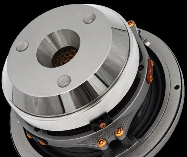 The robust MW-1 motor which includes the large titanium voice coil, and a neodymium magnet, reduces distortion levels to a fraction of those found in even the best alternatives available on the market. A copper sleeve encapsulates the entire distance of the voice coil, decreasing the inductance to about 1/10 of its original value. This feature substantially reduces driver non-linearity and intermodulation distortion by increasing its overload handling capability.