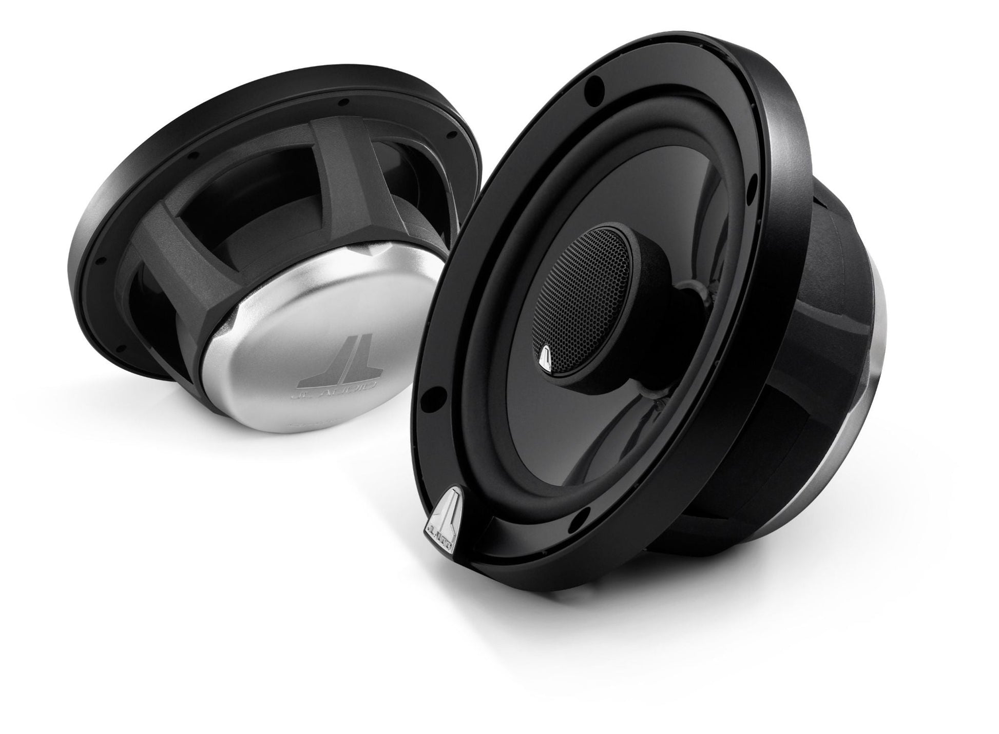 Woofer grilles are included, each consisting of a black grille tray and a black steel mesh grille with an electroformed JL Audio logo.