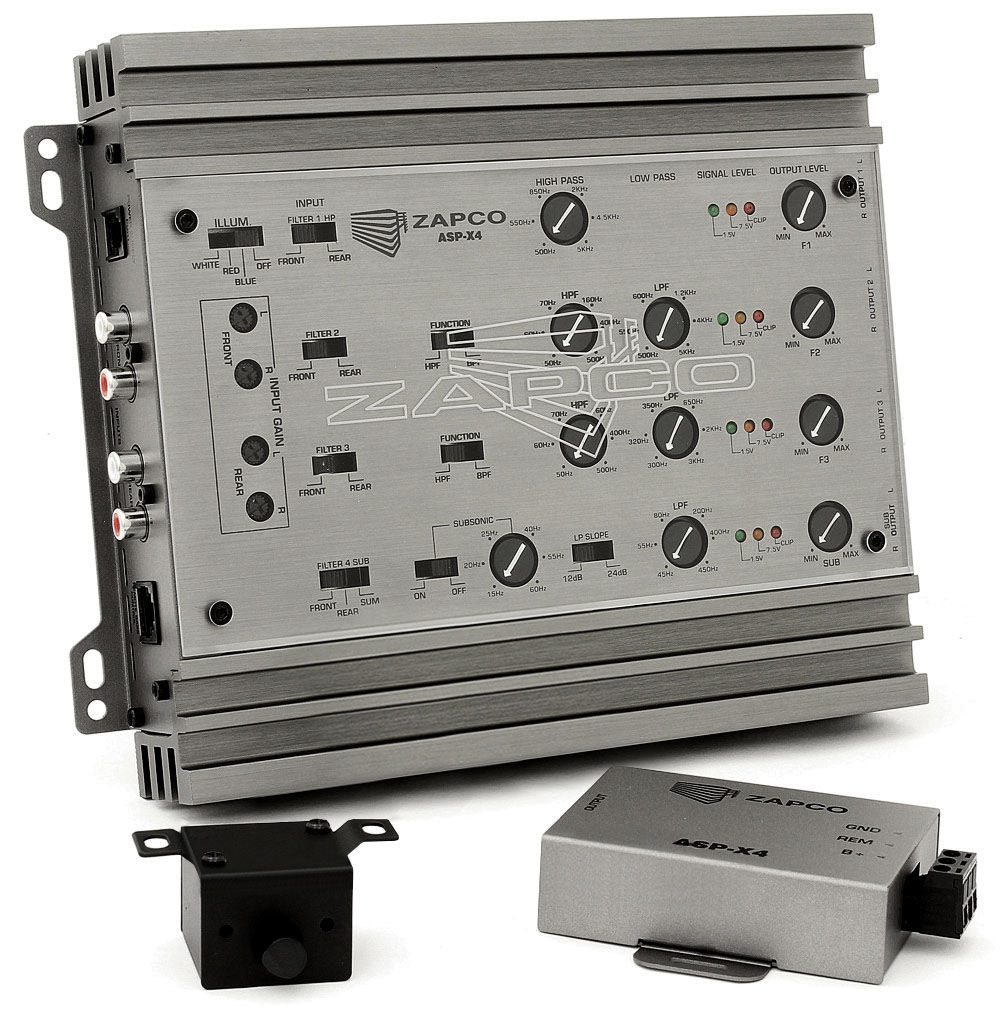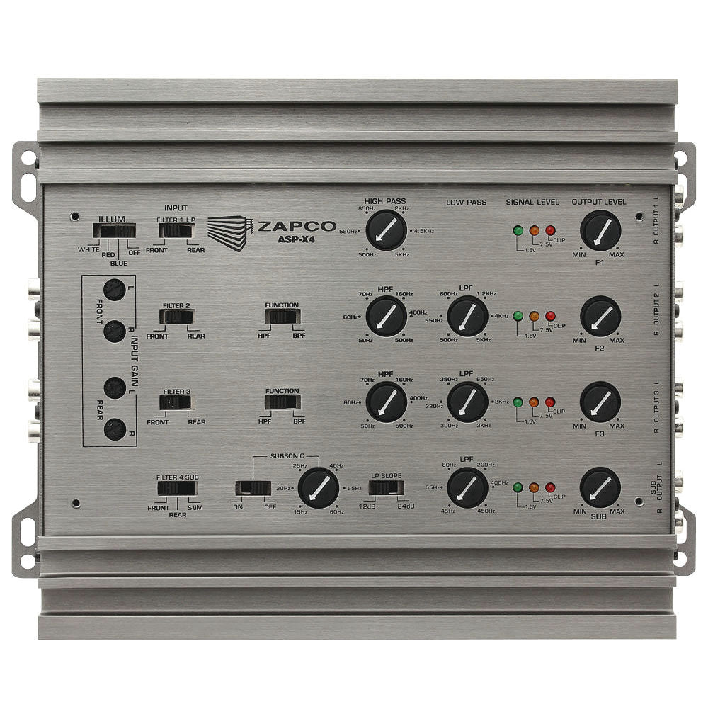 The Zapco ASP-X4 is definitely the “Mac Daddy” of Analog Electronic Crossovers. This unit was designed originally to compliment our new LX models of the Zapco Z-Series amplifiers. The LX are no-compromise, no holds barred, sound quality competition amplifiers and have no preamp functions other than input sensitivity. It takes a special crossover to meet the standards of an amp like the LX Series, and the ASP-X4 has just what it takes, and then some.